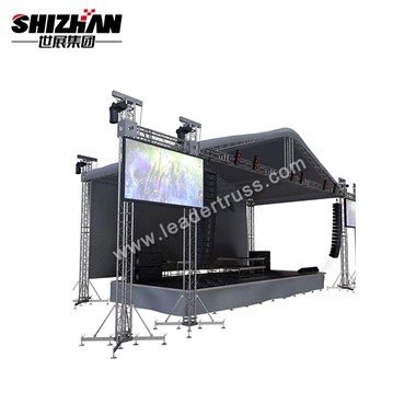 Event lighting stage truss is also called aluminum stage roof truss system,the structure was made by aluminum stage,aluminum truss,led lights,sound speakers and led wall.